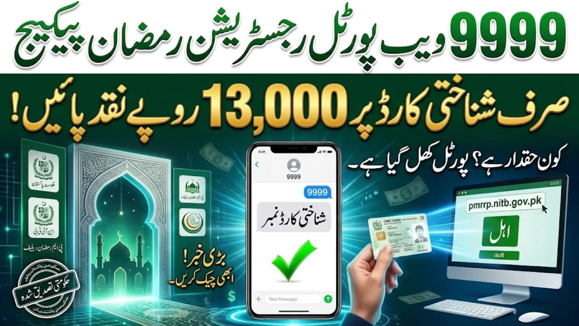 حالیہ اپڈیٹ: حکومت پاکستان نے رمضان 2026 کے لیے 9999 pmrrp.nitb.gov.pk پورٹل فعال کر دیا ہے، جس کے ذریعے اہل خاندان اپنے CNIC کی تصدیق کر کے 13,000 روپے ایک مرتبہ کی مالی امداد حاصل کر سکتے ہیں۔ اس پورٹل کے ذریعے آن لائن یا SMS 9999 کے ذریعے فوری اہلیت جانچی جا سکتی ہے، جبکہ نظام خودکار ڈیجیٹل سکریںنگ اور قومی ڈیٹا بیس کے ذریعے شفاف تقسیم کو یقینی بناتا ہے۔ اہل خانہ کو چاہیے کہ اپنے ریکارڈز اپڈیٹ رکھیں اور غیر سرکاری ایجنٹس سے دور رہیں تاکہ امداد بروقت وصول ہو سکے۔