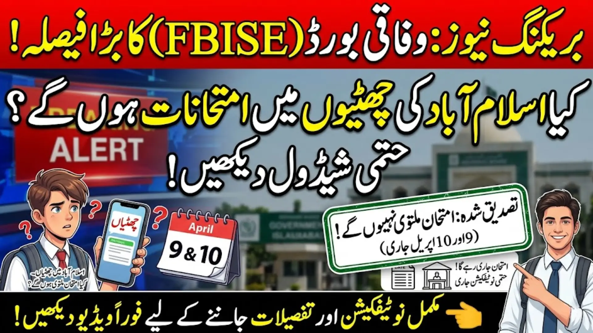 The announcement regarding the FBISE Exams Schedule April 2026 has brought clarity for thousands of students across Pakistan. After the Islamabad administration declared April 9 and 10 as local holidays, many students were unsure whether their exams would be postponed or canceled. This confusion created concern among candidates preparing for important papers.