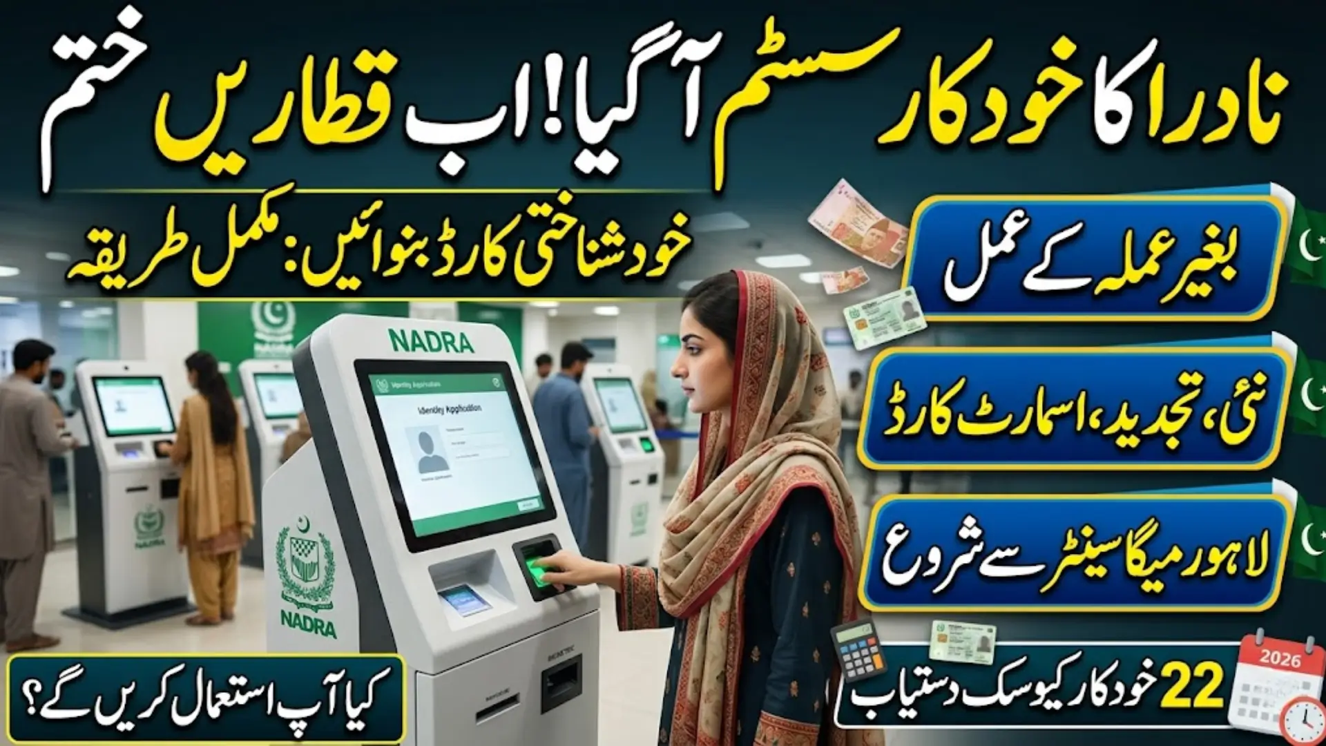 The NADRA self service kiosk system Pakistan has been implemented at the Mega Centre in Lahore with proper planning. A total of 22 counters have been allocated for the new automated system to handle a high number of visitors efficiently.