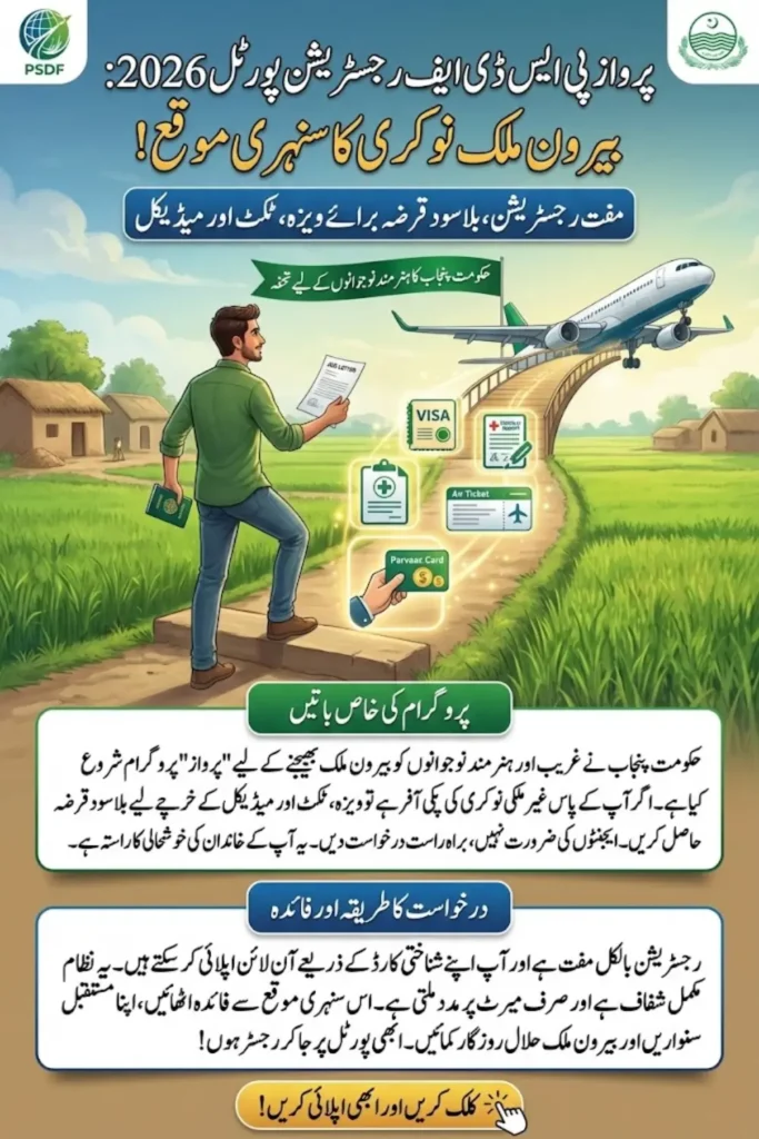 Parvaaz PSDF Registration Portal 2026 is a major initiative of the Punjab government aimed at supporting students and skilled youth who want to work abroad but cannot afford high pre-departure costs. Many young Pakistanis secure overseas job offers every year, yet financial barriers such as visa fees, medical tests, and air tickets stop them from moving forward.
