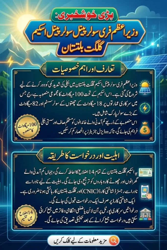 Permanent residents of Gilgit-Baltistan with low or middle income and limited electricity access can apply. A valid CNIC and proof of residence are required.